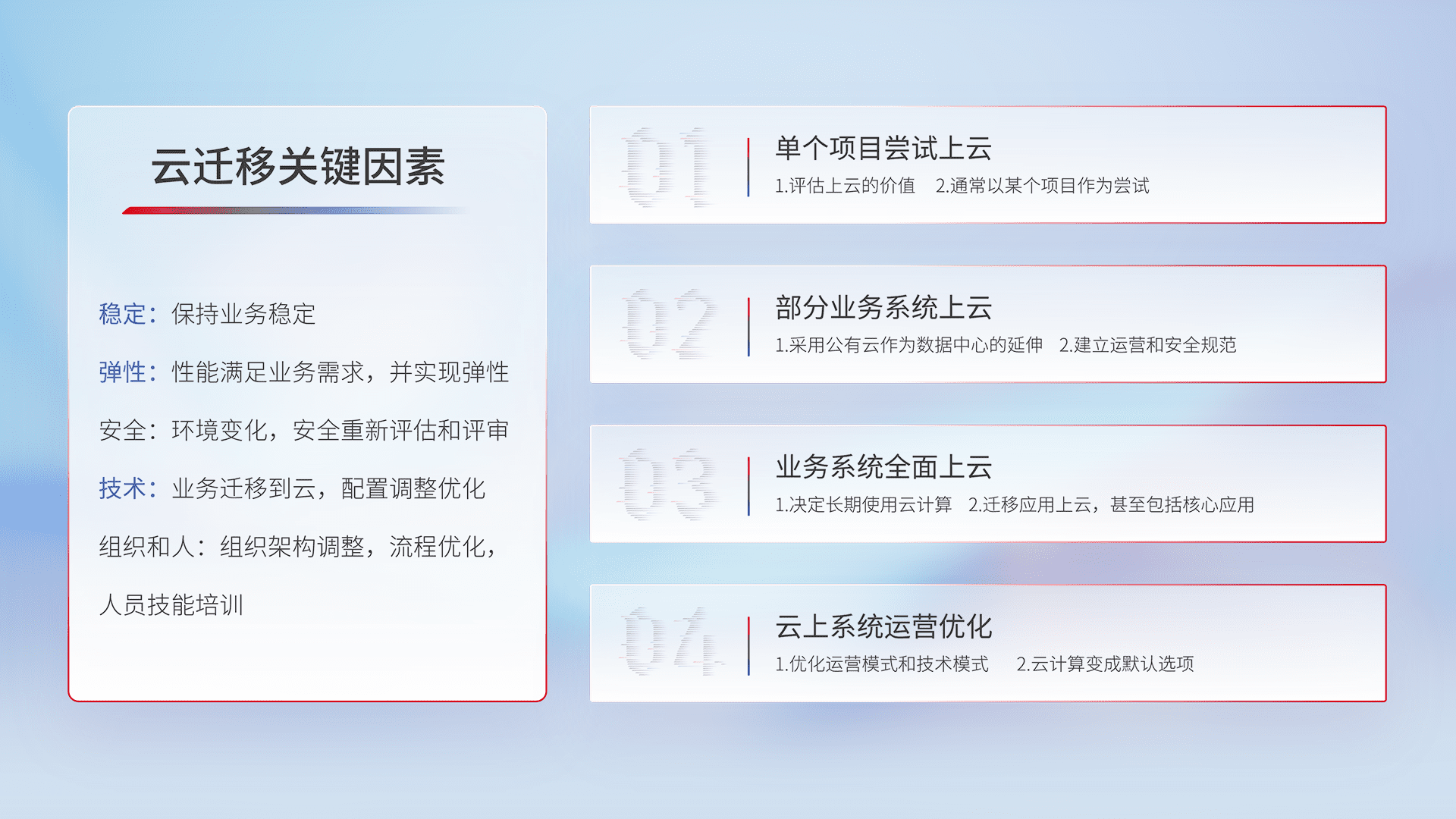 结合实际业务,,,从规划设计、、、云平台选型、、、云原生改造、、、、数据迁移、、集成交付,,迁移全过程为客户识别最佳上云路径,,做好风险识别管理,,,,设计网络架构、、身份权限、、安全审计合规、、操作审计、、日志审计、、、、监控告警策略、、多站点容灾设计等,,,对云上基础设施进行整体规划,,,提升IT治理水平,,,以满足弹性、、高可用、、高性能的需求。。。